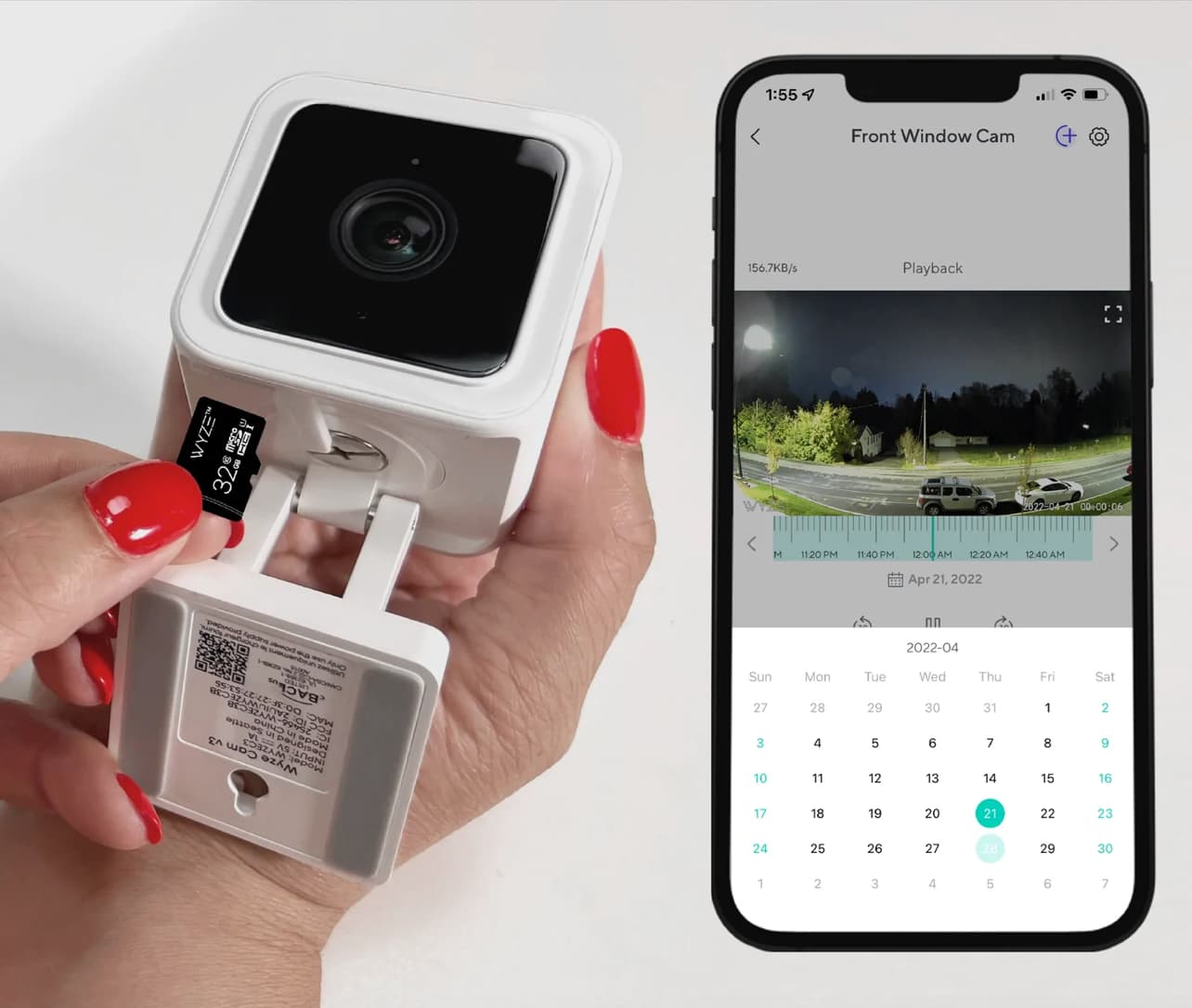 Store Footage Locally on a MicroSD CardInsert up to a 128GB MicroSD card to store motion events or record 24/7 footage. We even built a custom Wyze app calendar so you can scroll through months of stored footage quickly.