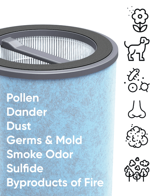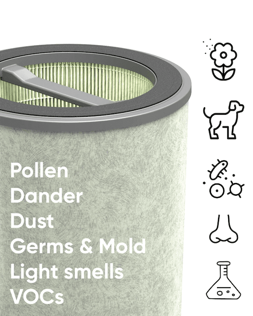 Captures allergens, dust, mold, bacteria, viruses, dander, light odors, cooking smells, and VOCs.