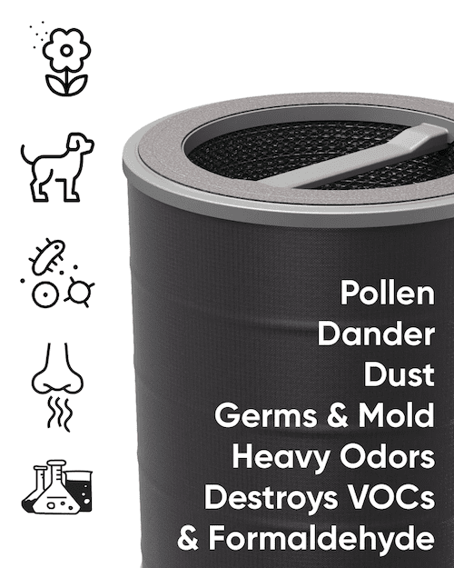 Captures allergens, dust, mold, bacteria, viruses, dander, heavy odors, and cooking smells. Destroys formaldehyde and other VOCs.