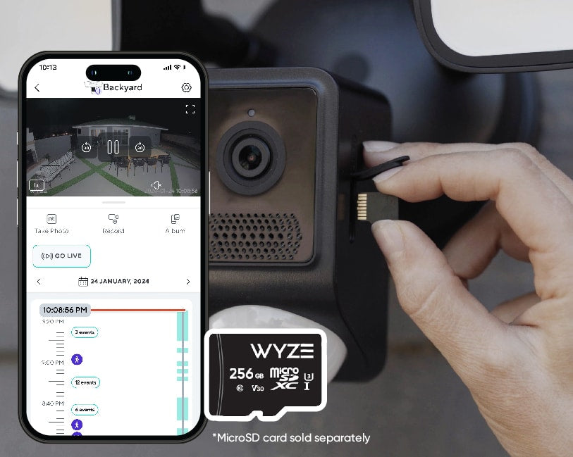 Yes, Wyze Cam Floodlight v2 has a microSD card slot in the camera that allows you to record 24/7 and store videos locally. The microSD card slot supports up to 265 GB (exFAT and FAT32 formats).