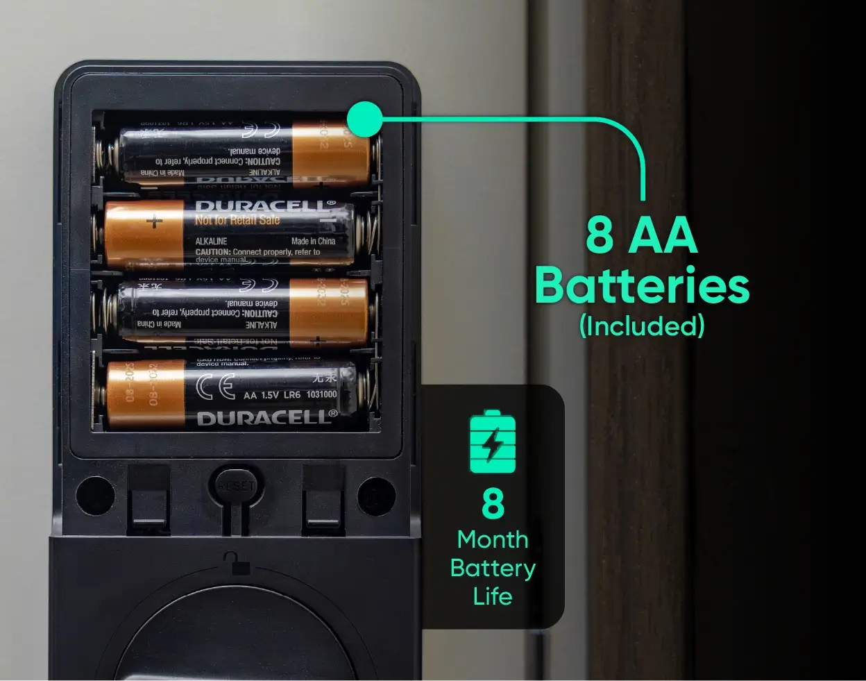 A: Wyze Lock Bolt v2 comes with eight AA batteries in the box. These batteries keep the connection to Wi-Fi rock-solid and give you the full feature set you love from your lock—no compromises.