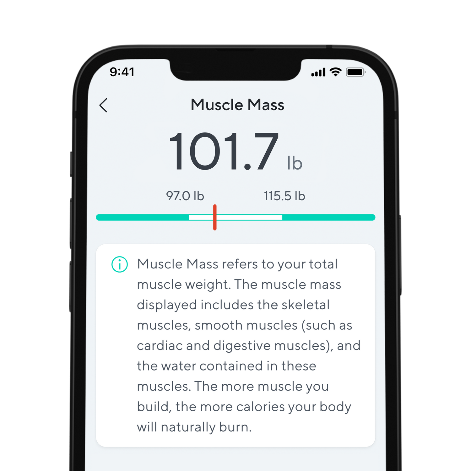 - In-App: Weight, Body Fat Percentage, Heart Rate, Lean Body Mass, BMI, Muscle Mass, Muscle Mass %, Visceral Fat, Basal Metabolic Rate, Bone Mass, Metabolic Age, Protein, Body Water Percentage.