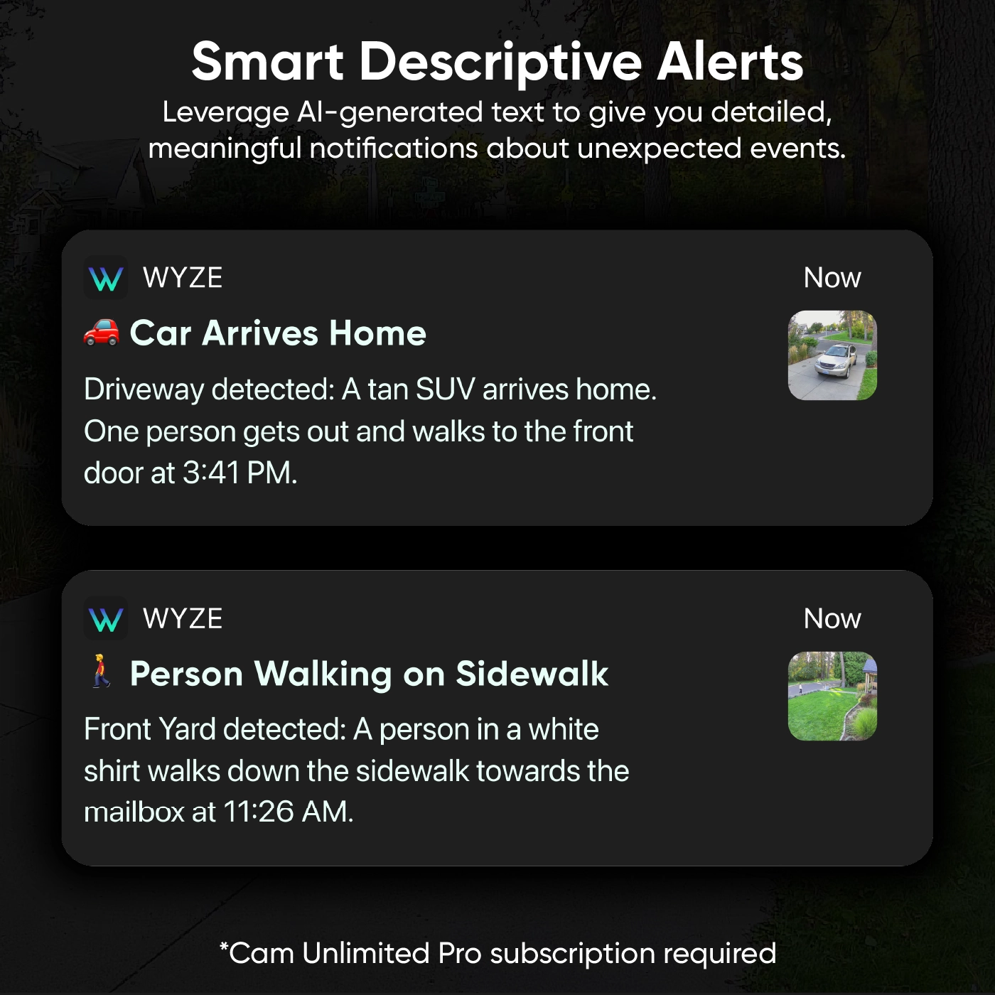 Customize your detections and notifications. Get a detailed alert of what's happening with Descriptive Alerts, available with Cam Unlimited Pro. Click to learn more.